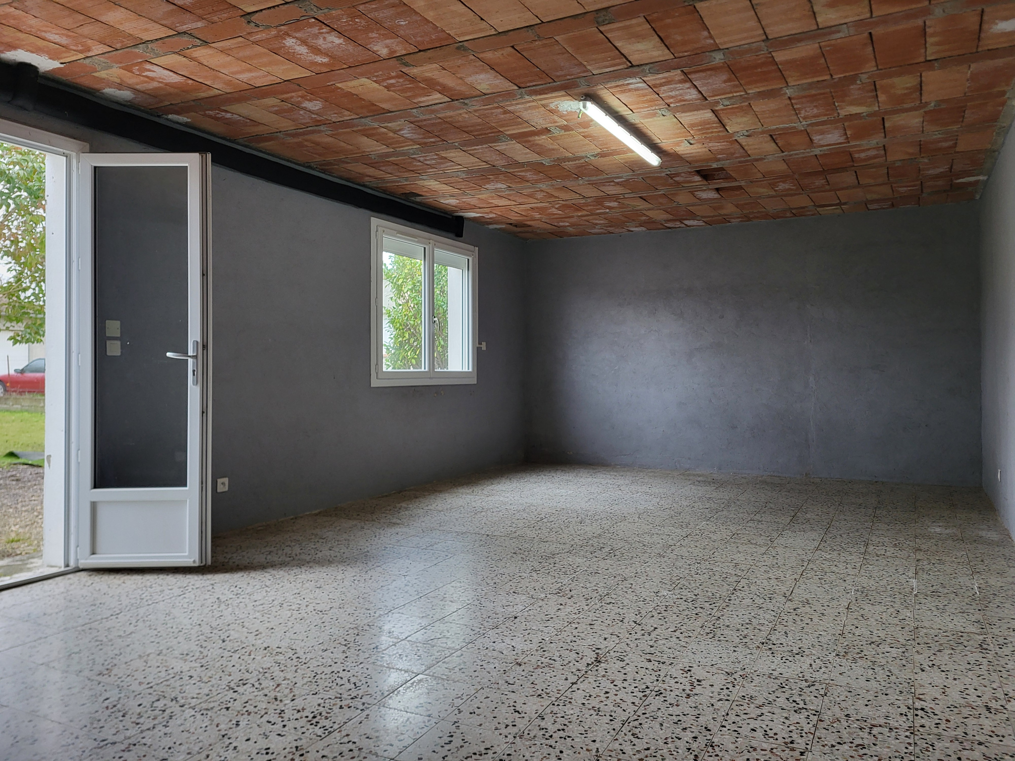 Au rdc, un grand garage de 61 m² et un espace habitable de 80 m² avec sortie sur le jardin à l'arrière de la maison.