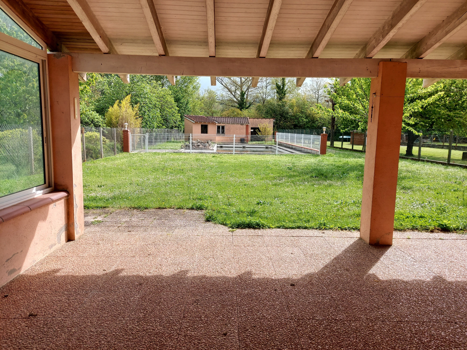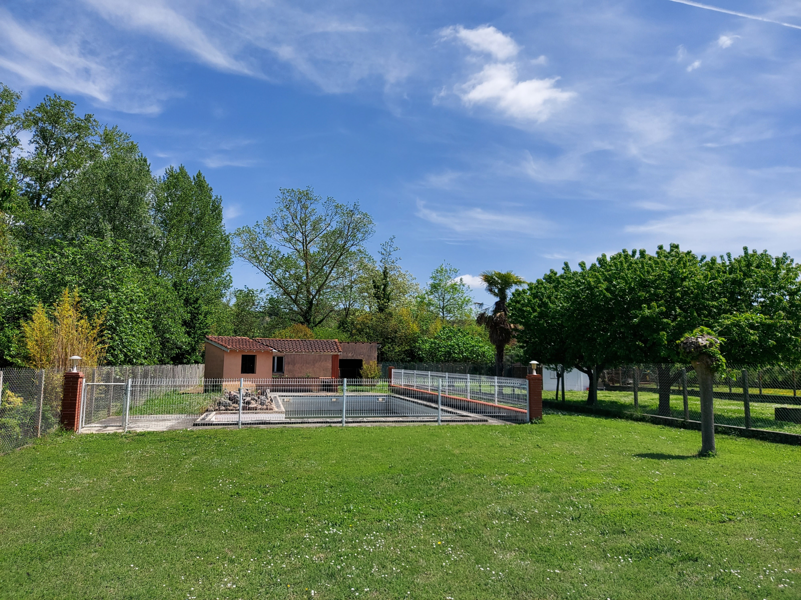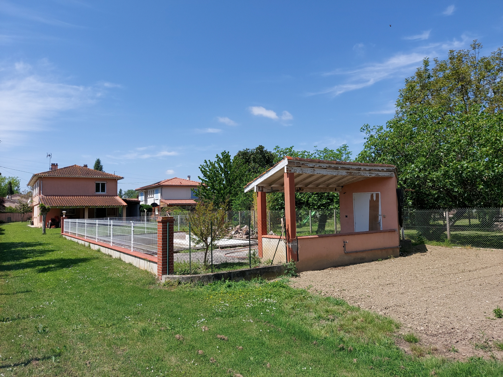 Terrain clôturé de 1330 m² avec piscine de 11x5 à rénover. Un deuxième garage en bout de parcelle de 43 m².
